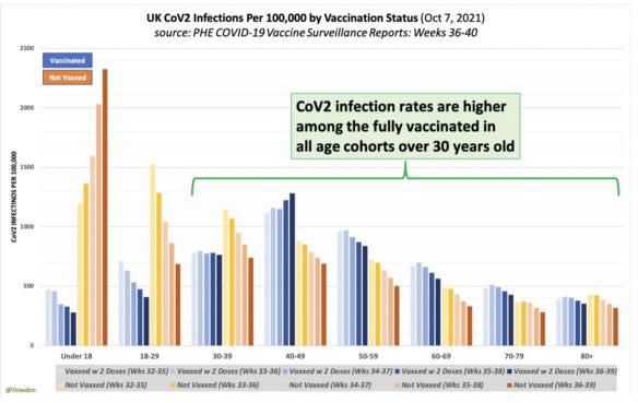 There is also something strange going on in the UK, where infection rates are higher among the vaccinated than the unvaccinated. (The numbers for younger people are not representative because so few people in those cohorts are vaccinated). The source for below is here.